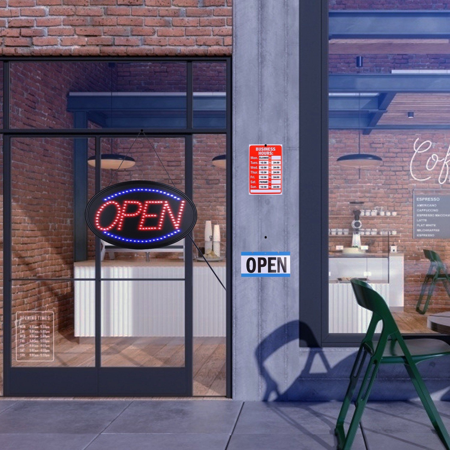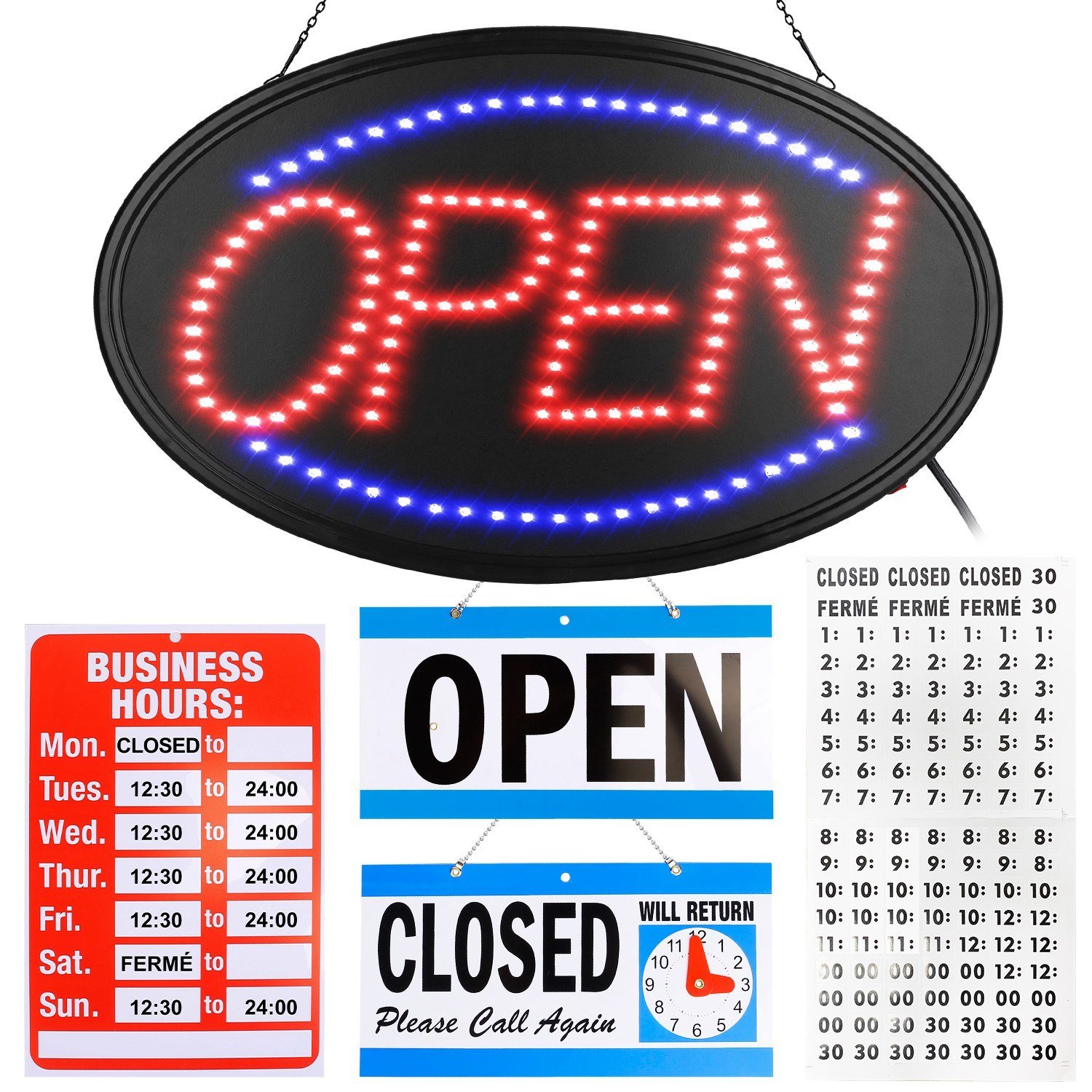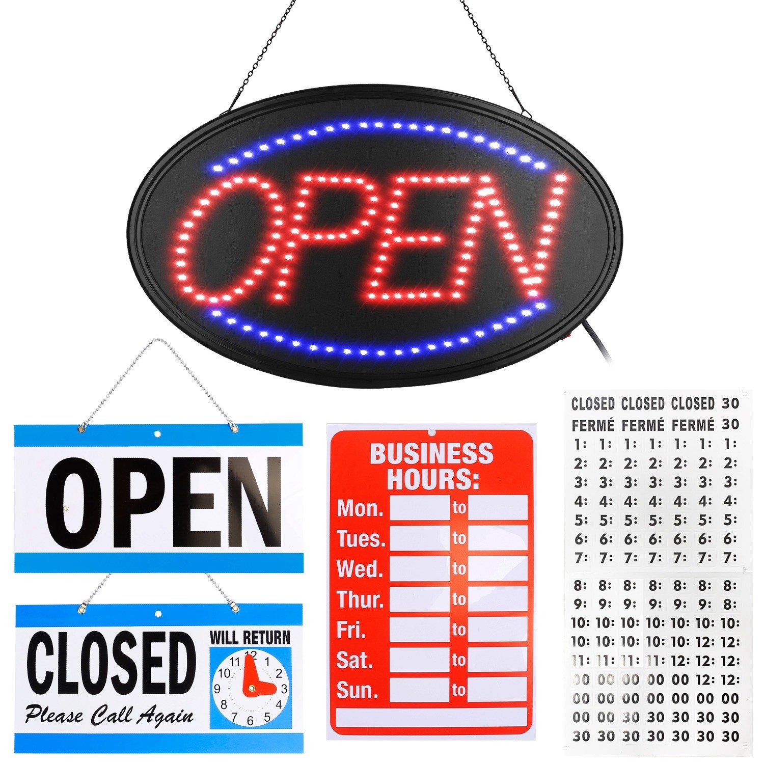 *Extra Business Hours & Open Closed Sign*:Extra 11.69x7.6in Business Hours sign and a reversible 11.34x5.79in OPEN-CLOSED sign are able to let customers know that you are open or closed in your store and when you will return .