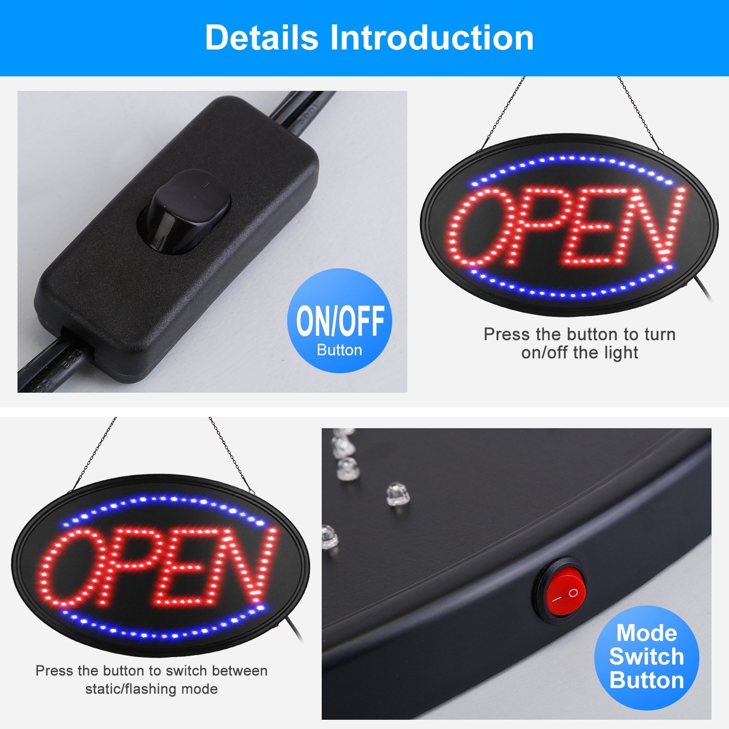 *Dual Attractive Lighting Modes*:Designed with Flashing Mode and Steady Mode with red big LED 'OPEN' letters and its surrounding blue LEDs to meet different needs and attract all kinds of clients during day or at night.