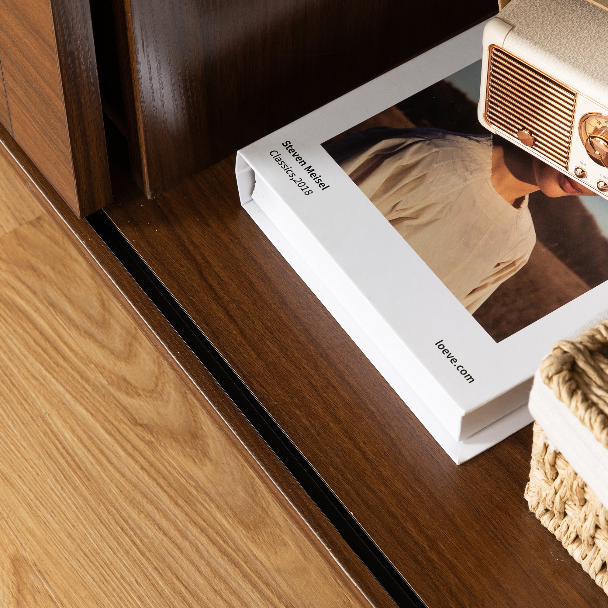 The cabinet with sliding barn door design, can save the open space, the design of four drawers and cabinet doors, reasonable partition, can make your collection more reasonable and clean.